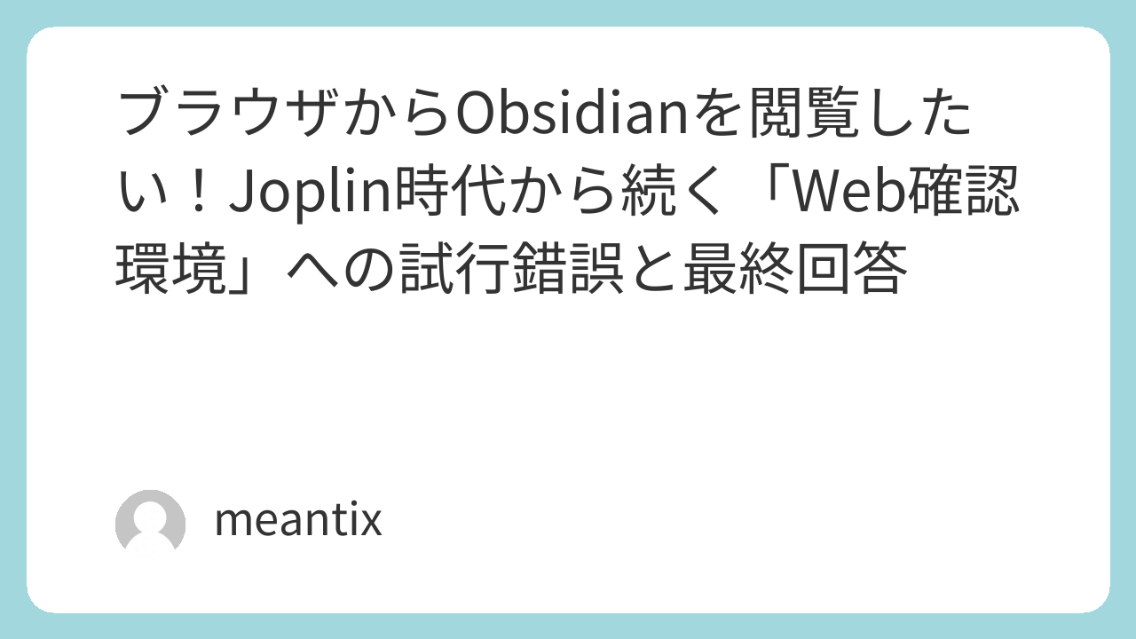 今回は、JoplinのWeb版から始まり、ObsidianのWeb閲覧環境を構築するまでの、エンジニアらしい(?)泥臭い試行錯誤の記録をまとめます。