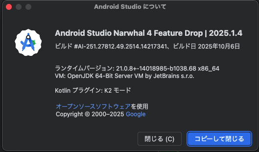 - メニューバーから「Android Studio」>「About Android Studio」を選択します。