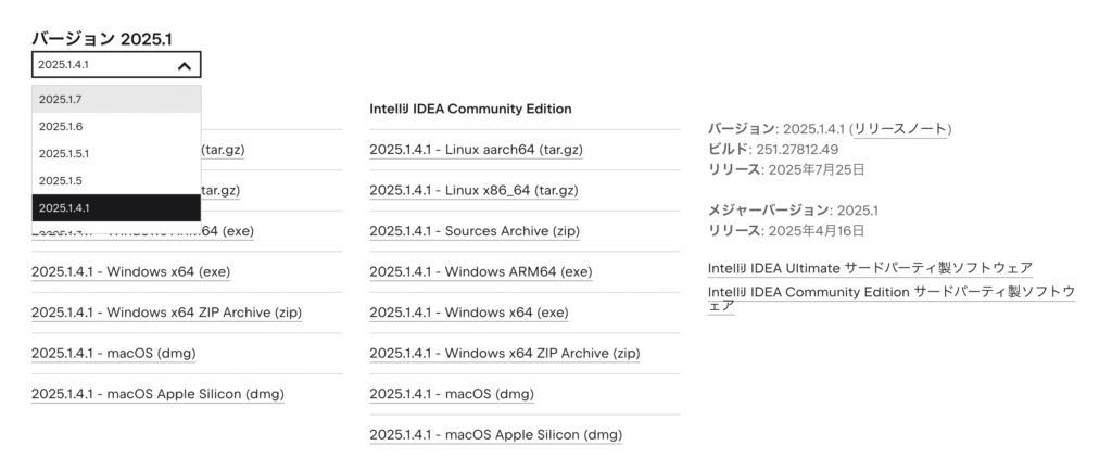 2025.1.4)と同じバージョンの「IntelliJ IDEA Community Edition」のダウンロードリンクを探します。- 例: