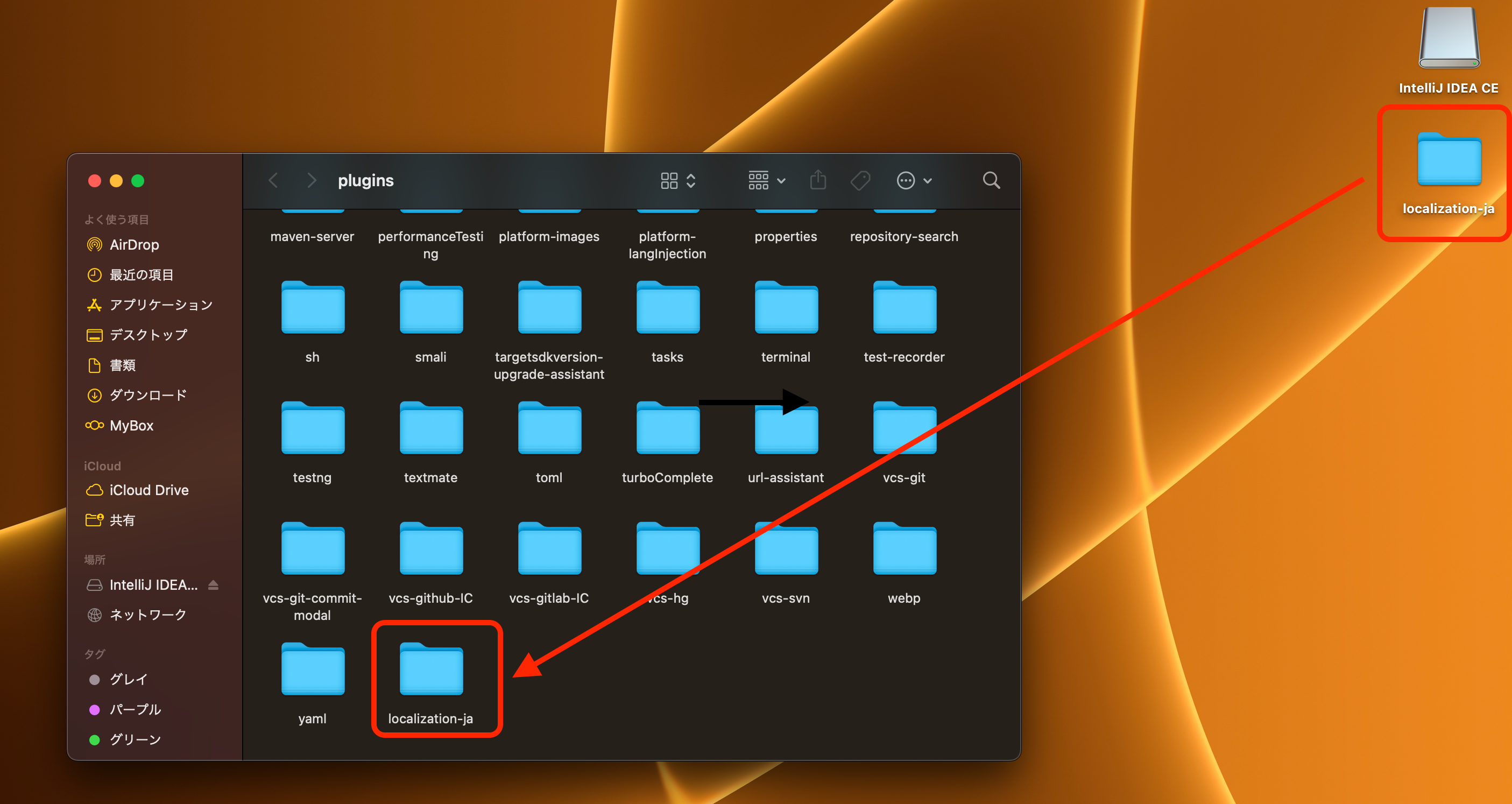 cp -rf /Volumes/IntelliJ\ IDEA\ CE/IntelliJ\ IDEA\ CE.app/Contents/plugins/localization-ja ~/Desktop/を実行します。 - すると、デスクトップに「localization-ja」というディレクトリがコピーされます。